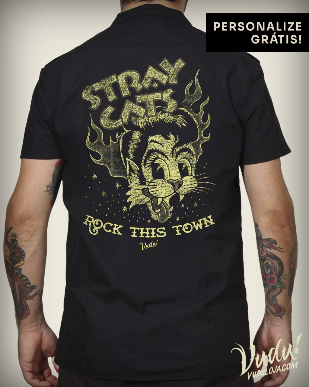Kustomização autêntica é ter seu nome na camisa! Inspirada nas work shirts usadas pelas equipes de corrida de antigamente, essa camisa traz aquele estilo clássico de garagem com toque moderno e uma estampa pra quem é fã raiz do rockabilly.