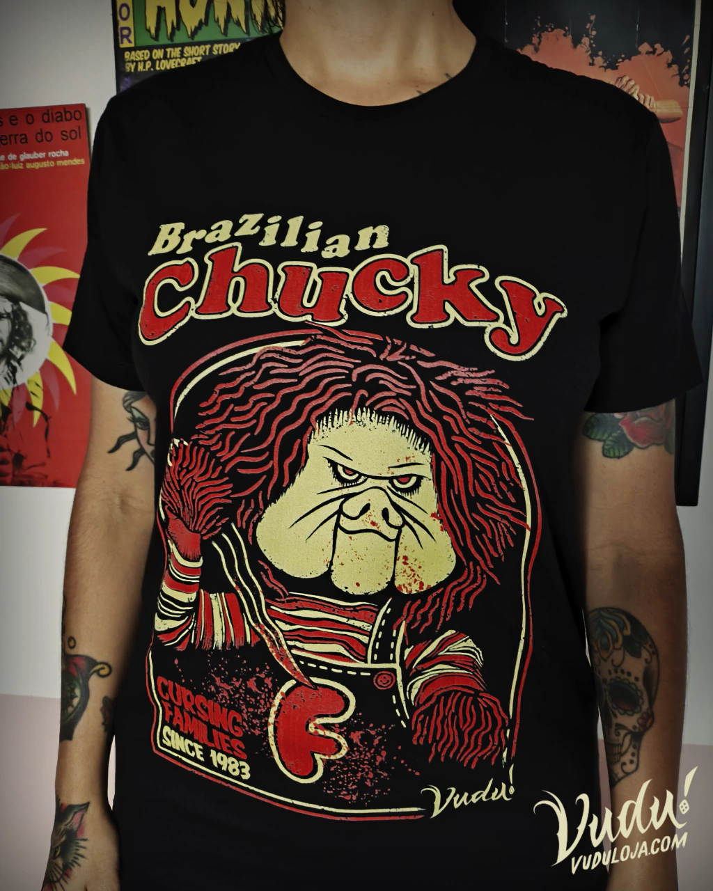 Sabe aquele papo de que o boneco do Fofão tinha uma adaga escondida dentro? Então... a estampa pega essa lenda urbana raiz e mistura com o caos do Chucky, o Brinquedo Assassino. Resultado: uma homenagem macabra à infância traumática de muita gente. É nostalgia com sangue nos olhos — direto do porão da cultura pop brasileira.